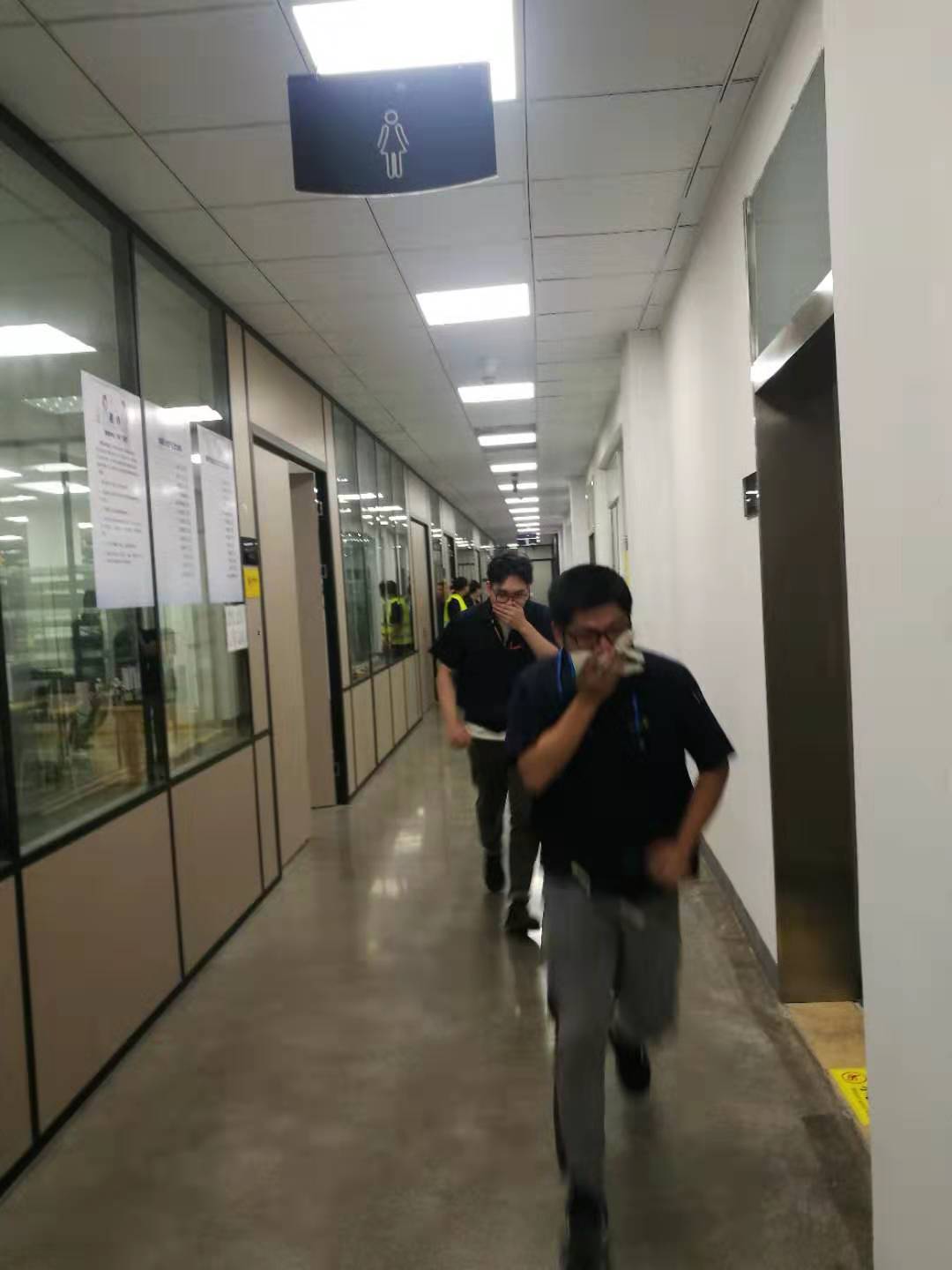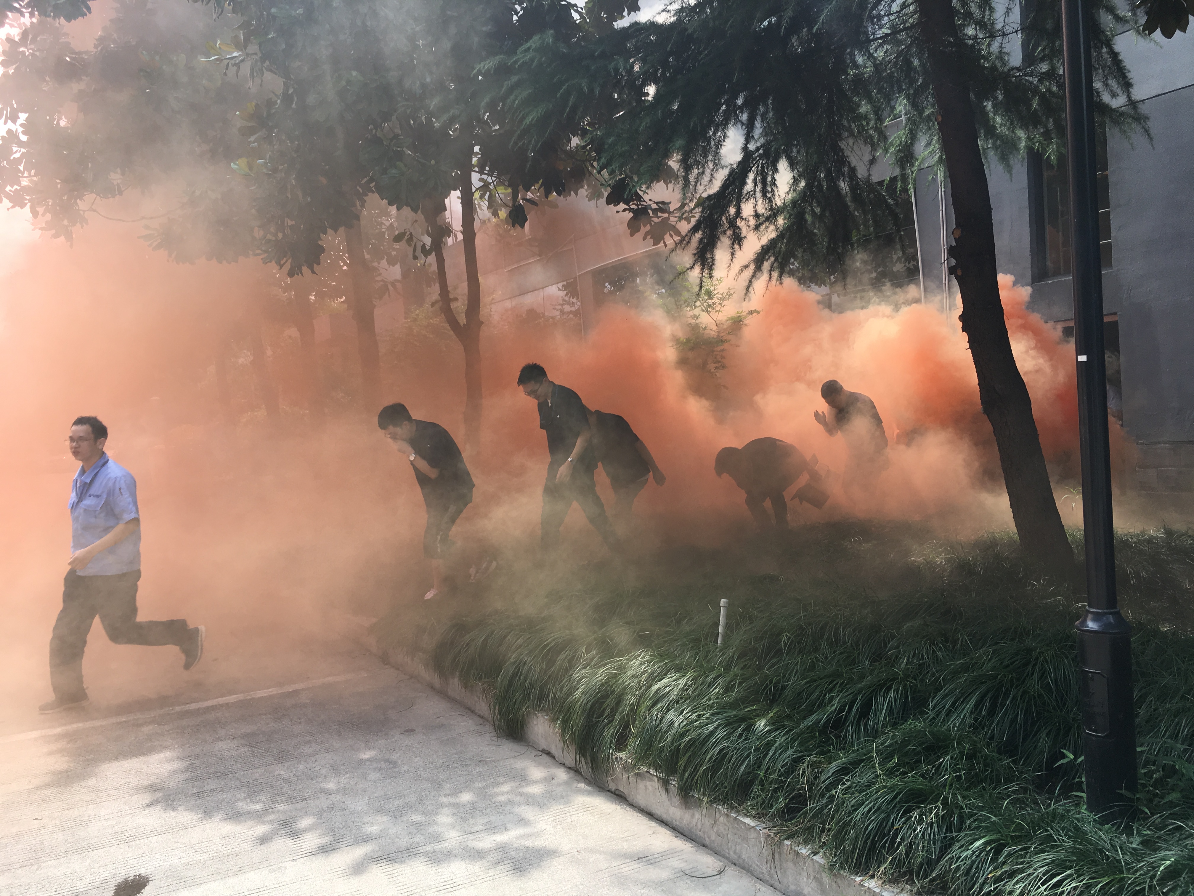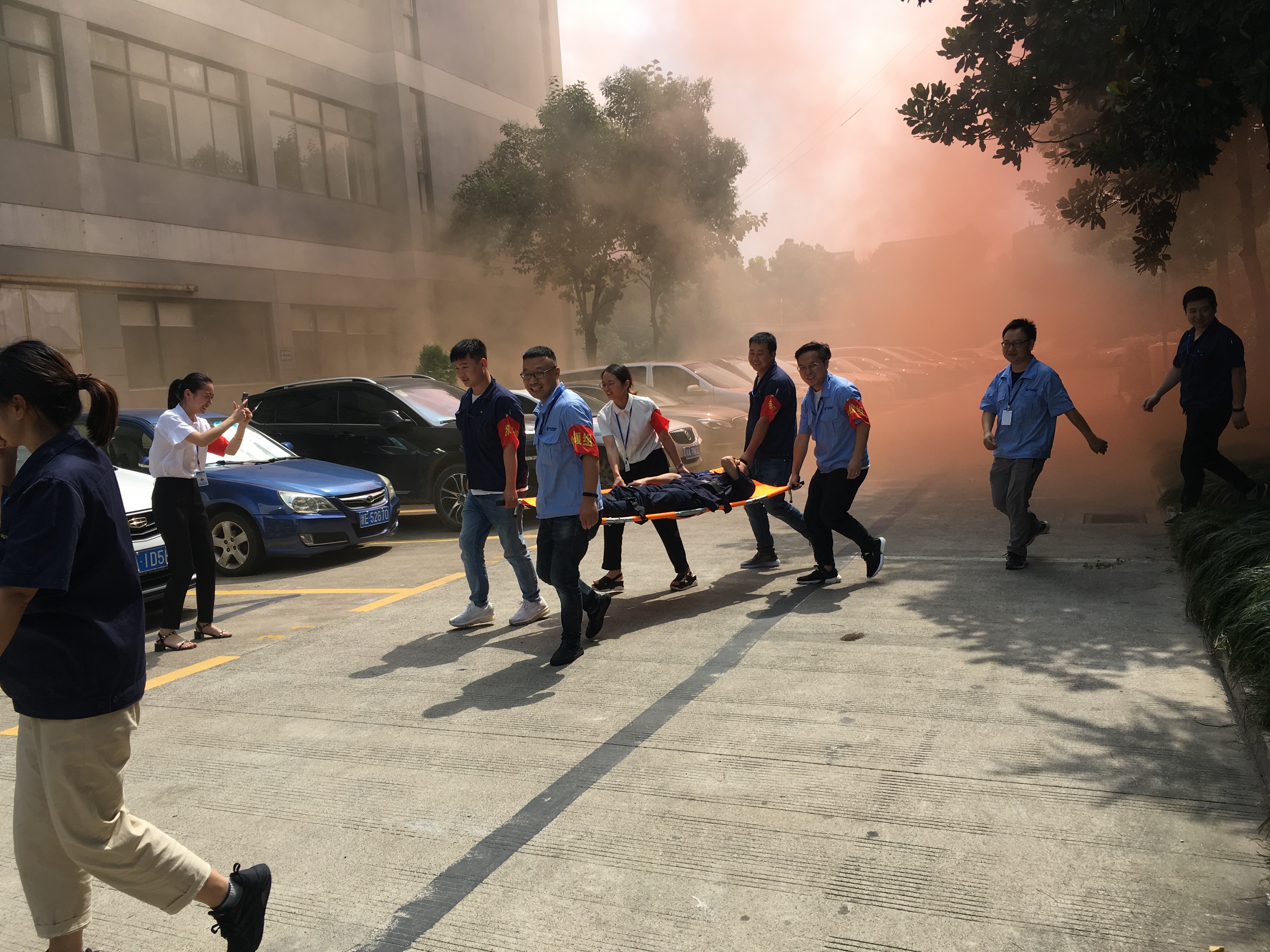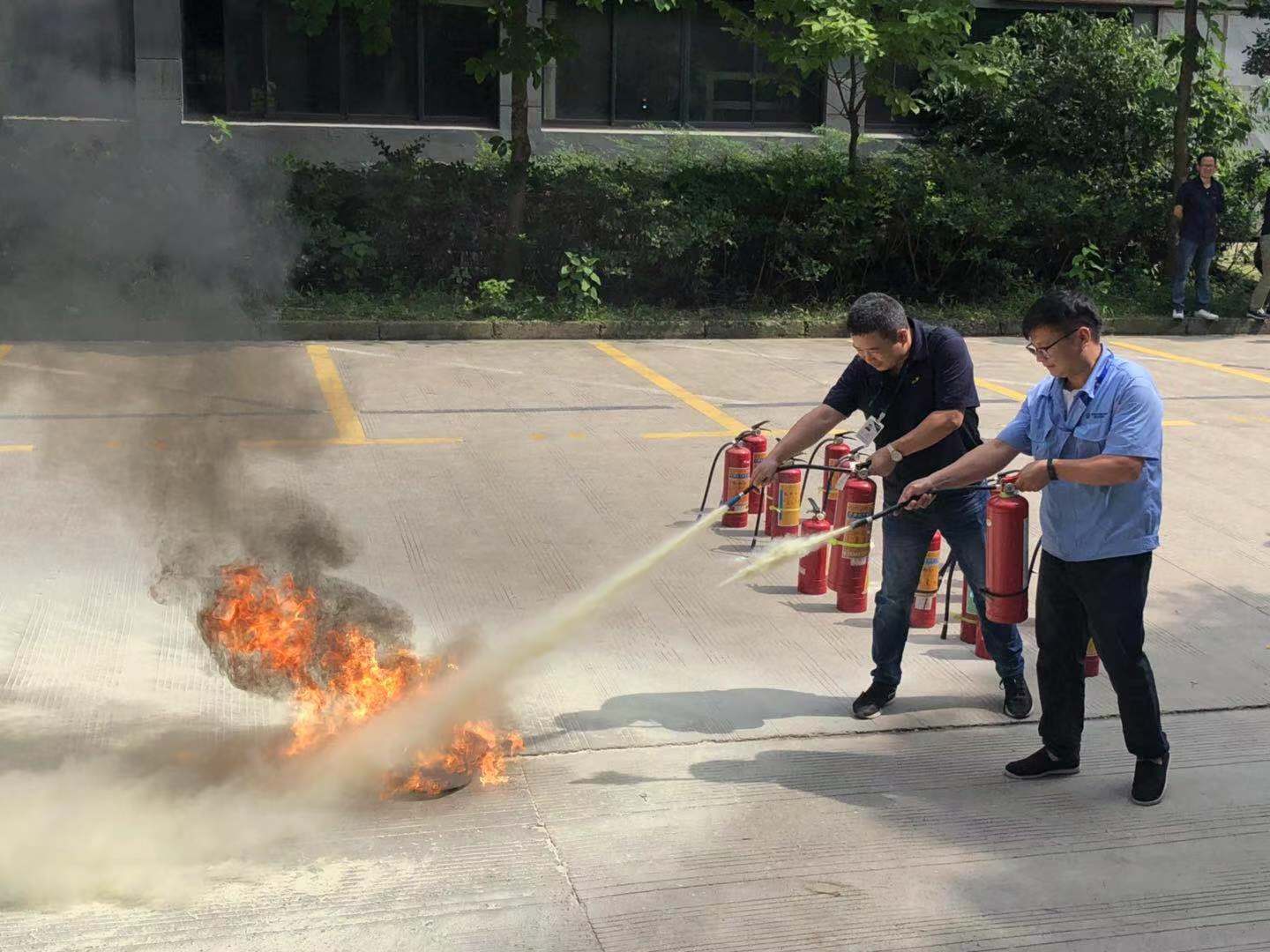 演练时,为了更加逼真,现场使用烟雾弹模拟火灾现场,各个职务人员协助配合,圆满完成火灾时逃生及伤员救助演练活动。疏散结束后,每位员工实践使用干粉灭火器扑灭火源,切实掌握了灭火器的使用操作。